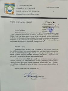 A Rádio Da Mata FM 87.9, do Distrito de São José da Mata, está prestes a completar 12 anos de história, e a trajetória de sucesso da emissora foi oficialmente reconhecida pela Câmara Municipal de Puxinana. O vereador José Flávio de Almeida Imperiano, popularmente conhecido como Flávio da Construção, apresentou uma moção de aplausos à rádio, aprovada pelo plenário, em homenagem ao aniversário que será celebrado no próximo dia 19 de outubro.