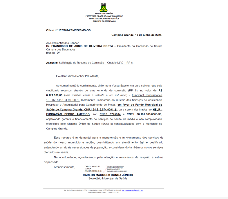 A título exemplificativo, segue abaixo e também anexo à presente nota, o Ofício nº 102/2024/PMCG/SMS-GS em que o Secretário de Saúde pede ao presidente da Comissão de Saúde da Câmara dos Deputados: